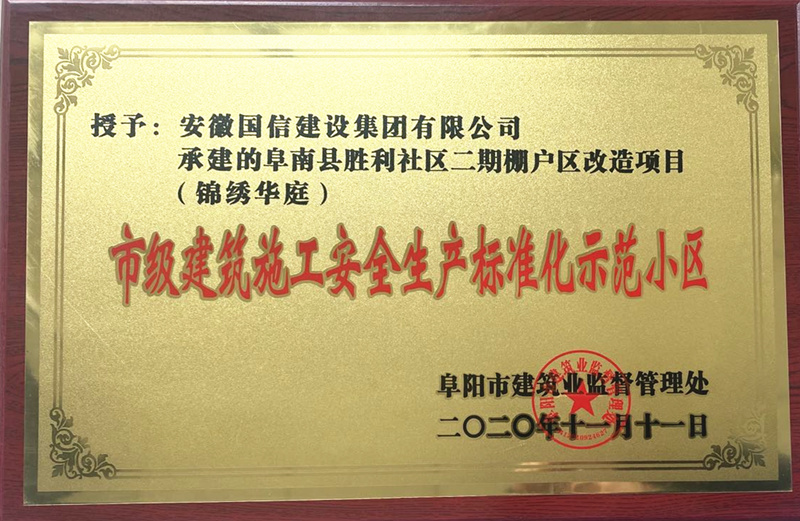 近日,由国信集团承建的阜南胜利社区二期棚改项目荣获“市级建筑施工安全生产标准化示范小区”称号。
