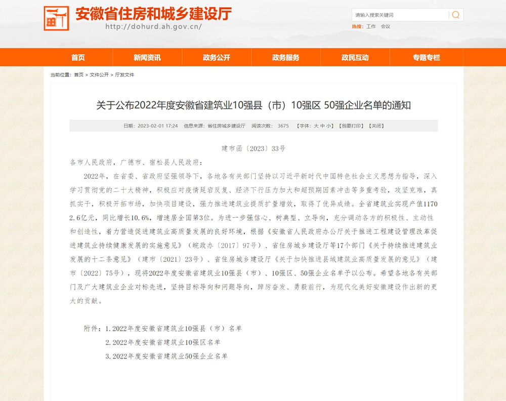 日前,安徽省住房和城乡建设厅发布了《关于公布2022年度安徽省建筑业10强县(市)10强区 50强企业名单的通知》。国信集团凭借稳健的发展态势和良好的企业声誉,再次荣登“安徽省建筑业50强企业”榜单,继2021年度后再次荣获该项荣誉。