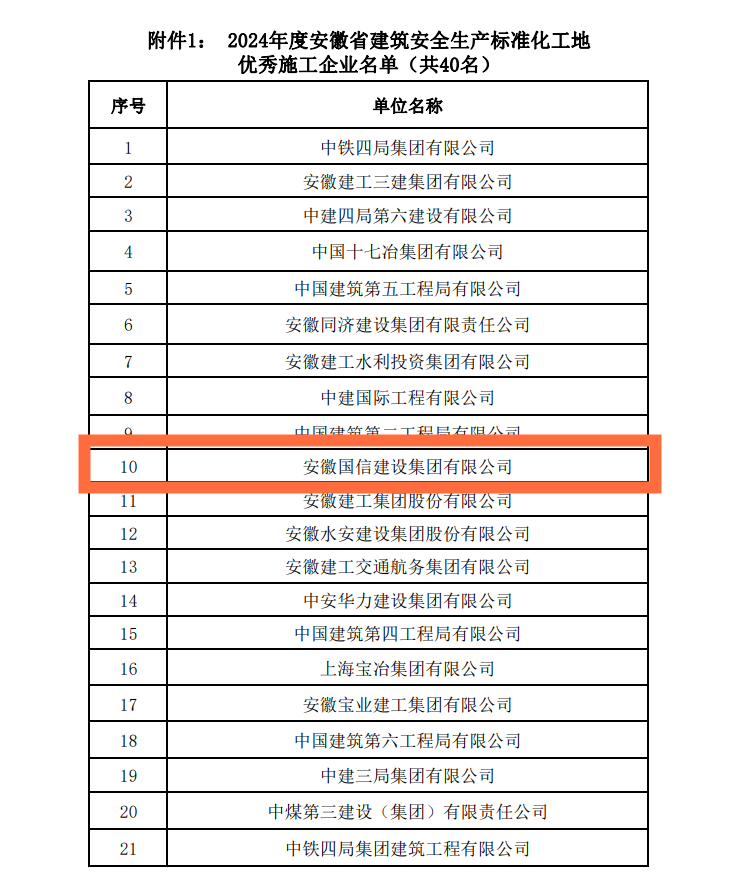 近日,安徽省建设工程质量与安全协会发布2024年度安徽省建筑安全生产标准化工地创建活动中取得优异成绩的单位及个人名单,国信集团榜上有名,获评安徽省建筑安全生产标准化工地优秀施工企业,此外多名安全管理人员获评优秀个人。