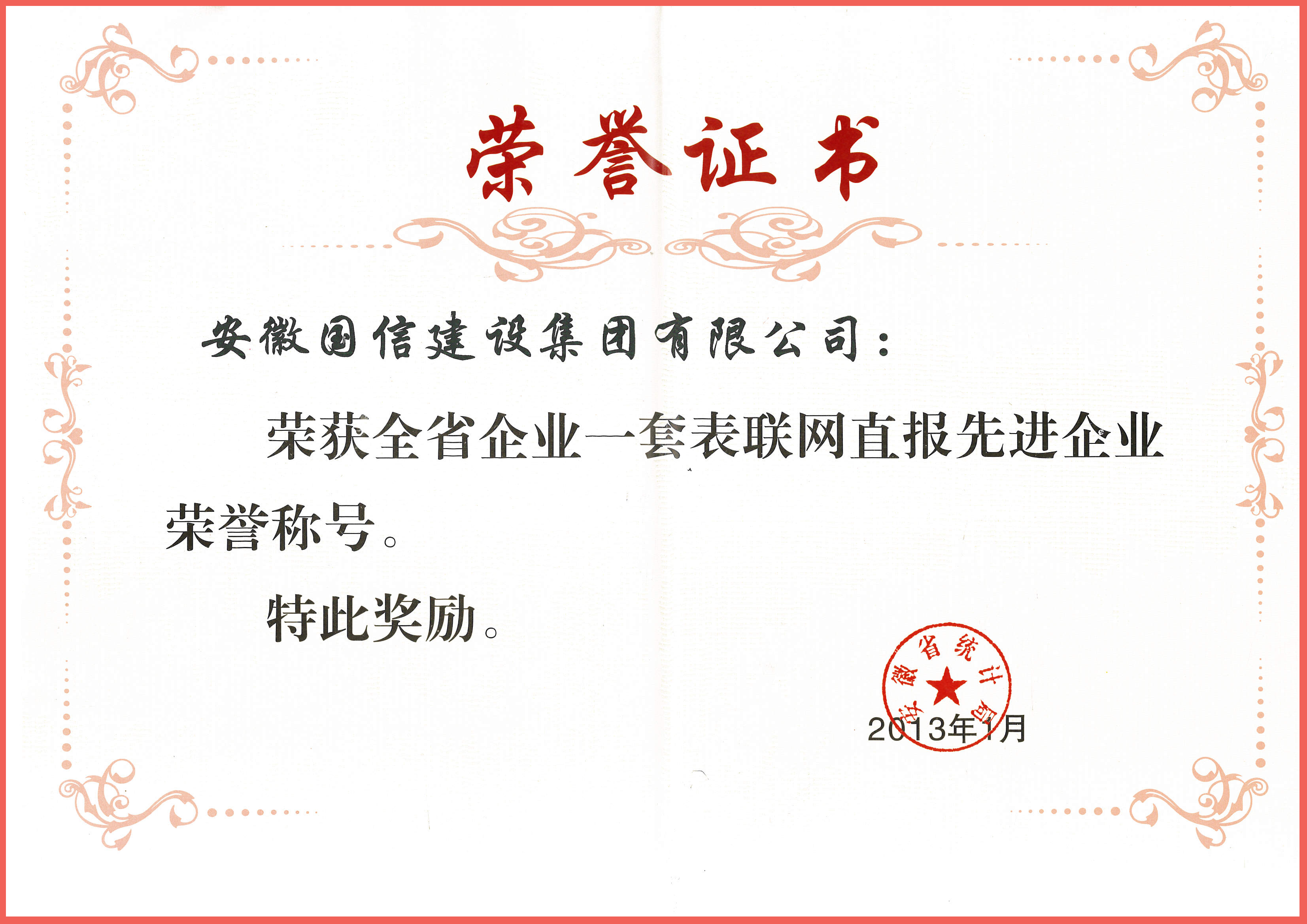 近日,国信集团公司被安徽省统计局授予“省企业一套表联网直报先进企业”荣誉称号,对该公司在填报企业一套表联网直报中各项工作成绩予以充分肯定,并以此鼓励公司再接再厉,继续认真做好公司企业一套表数据填报工作。企业一套表是指以统计调查对象为核心,整合现行报表制度,消除不同统计调查制度对同一调查单位的重复布置和重复统计,充分运用现代信息技术,实现数据采集方式的统一组织管理和统计资源共享的一种新的统计调查制度。国信公司坚持依法统计、严格确保数据质量,安排专人负责每次统计填报工作,做到及时有效的完成企业一套表联网直报工作。