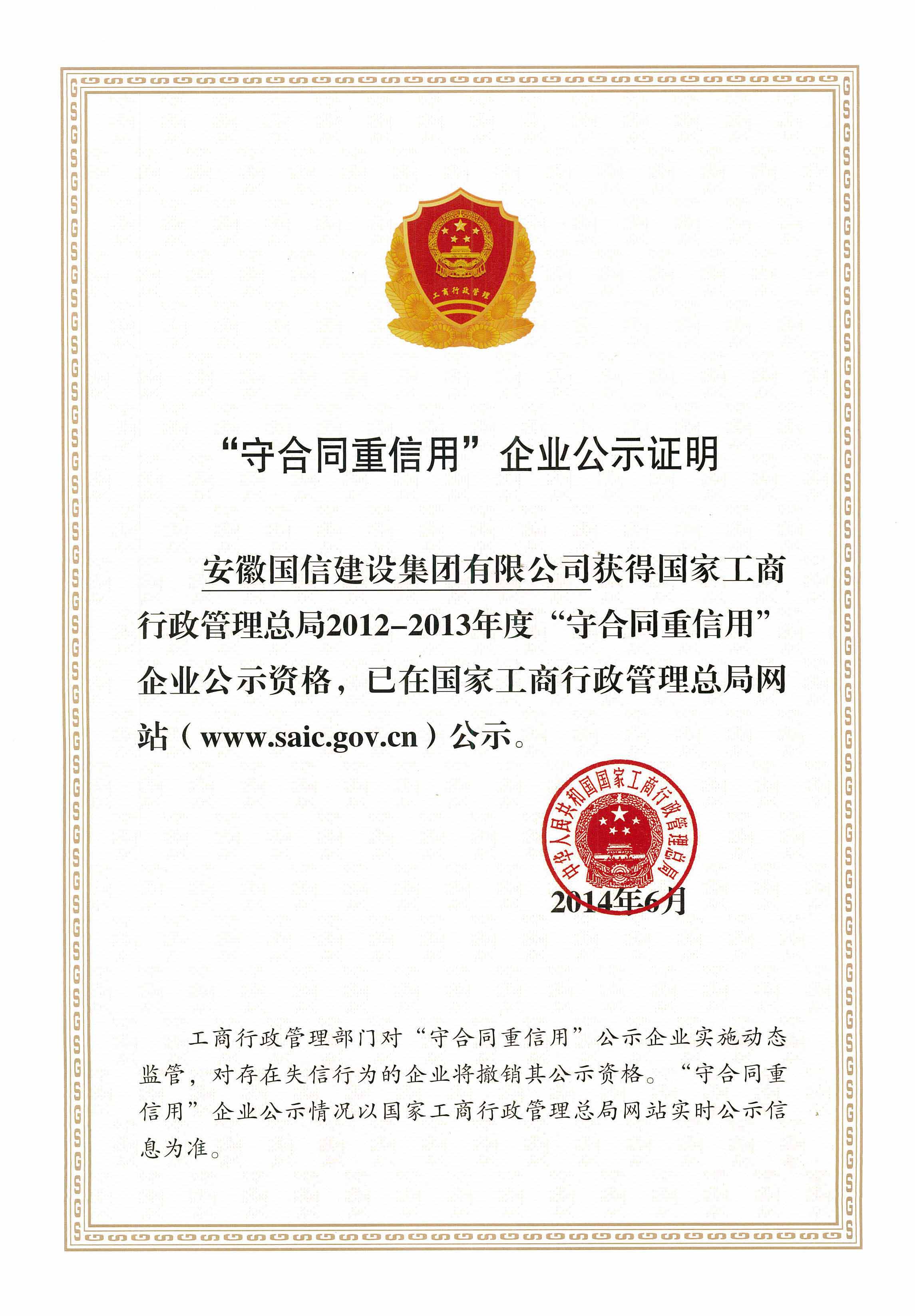 近日,安徽国信建设集团再次被国家工商总局认定为2012-2013年度国家级“守合同重信用”单位,并在国家工商总局网站进行公布。自荣获2010-2011年度国家级“守合同重信用”企业后,国信建设集团再获殊荣。