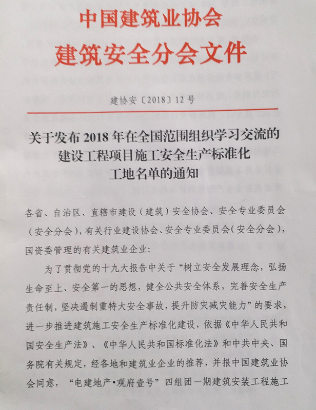 近日,中国建筑业协会建筑安全分会公布了关于2018年在全国范围内组织学习交流的建设工程项目施工安全生产标准化工地名单,由国信建设集团承建的信达天御二期S-17地块枫丹阁(1#-6#楼及地下车库)项目荣膺榜单。