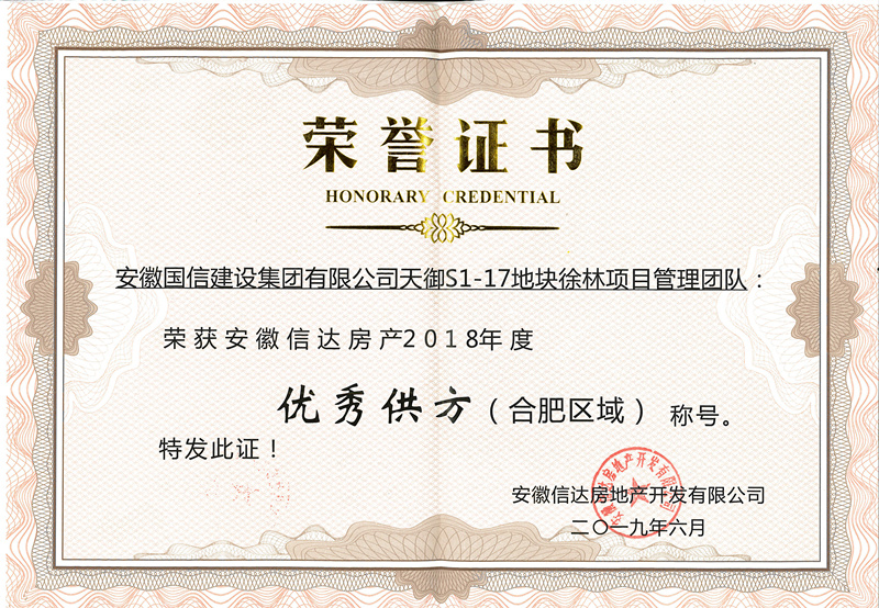 6月18日,在安徽信达房地产开发公司2018年度优秀供方表彰大会上,国信建设集团被授予“优秀供方”称号,这是继去年获得该荣誉后再一次荣获表彰。此次共有15家单位接受嘉奖,国信集团是唯一获奖的施工总承包企业。