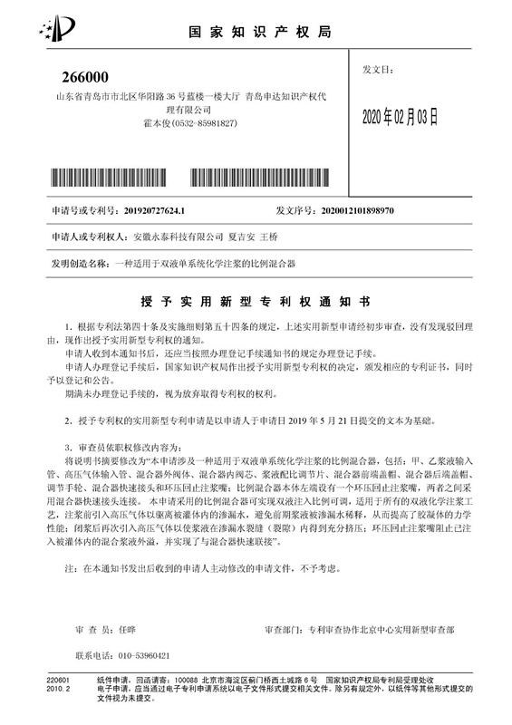 近日,由国信建设集团下属永泰科技公司研发的“一种双液单系统化学注浆的比例混合器”获得国家知识产权局的专利授权,取得实用新型专利证书,这是国信集团又一项拥有完全自主产权的研发技术。另外,由国信集团编制申报的“机械连接预应力混凝土竹节桩施工工法”也被省住建厅评为省级工法,将在全省施工现场推广应用。