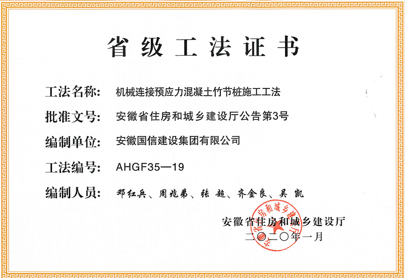“一种双液单系统化学注浆的比例混合器”专利技术弥补了传统注浆工艺的不足和缺陷,解决了注浆过程中比例不可调、不可控问题,提高了固结体的“双重止水”性能以及降低了混合浆液被渗漏水稀释的程度,大大提升了注浆效果。通过多项工程案例的验证,该项专利技术在工程实践中所体现出的经济效益和社会效益十分显著,达到了行业领先水平。“机械连接预应力混凝土竹节桩施工工法”是集团针对施工过程中的具体分项工程,综合考虑各种施工因素,在实施中不断总结、探索,并逐步形成的先进、经济、可行的综合施工工法。